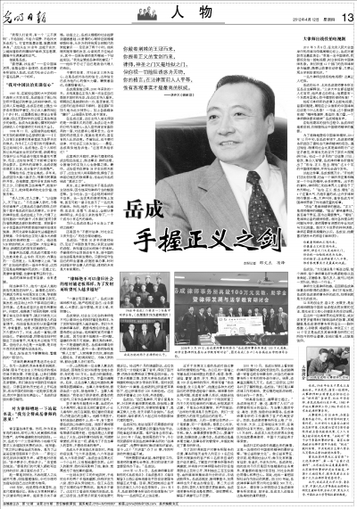 在这样一位律师界的名家背后,或许还有更多值得我们细细品味的故事,其精髓就是岳成律师事务所的信念——胸怀感激、心存敬畏、竭诚服务、伸张正义!这16个字正是岳成及其律师事务所同仁们所恪守的职业道德,在他们看来,这就是信仰。(本报记者 邵文杰 项锋)