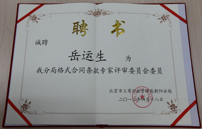 2012年4月18日,我所岳运生主任被聘为北京市工商行政管理局朝阳分局合同条款专家评审委员会委员