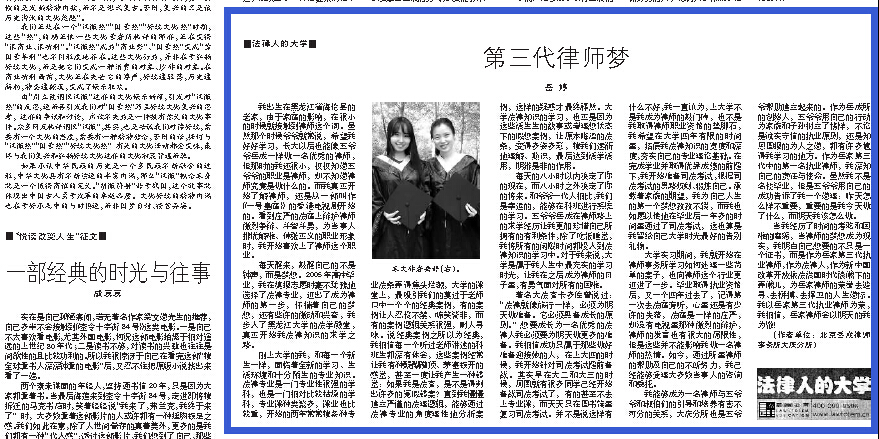 2015年7月10日《检察日报》第六版《法律人的大学》栏目刊登岳婷律师文章:第三代律师梦。